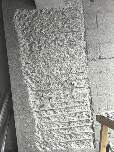 1、首先,將修復部位的松散混凝土鑿掉,以便用小錘子細鑿,以免損壞結構鋼筋。要求鑿出的混凝土表面外觀能達到切割假石的效果,無散石和混凝土顆粒。